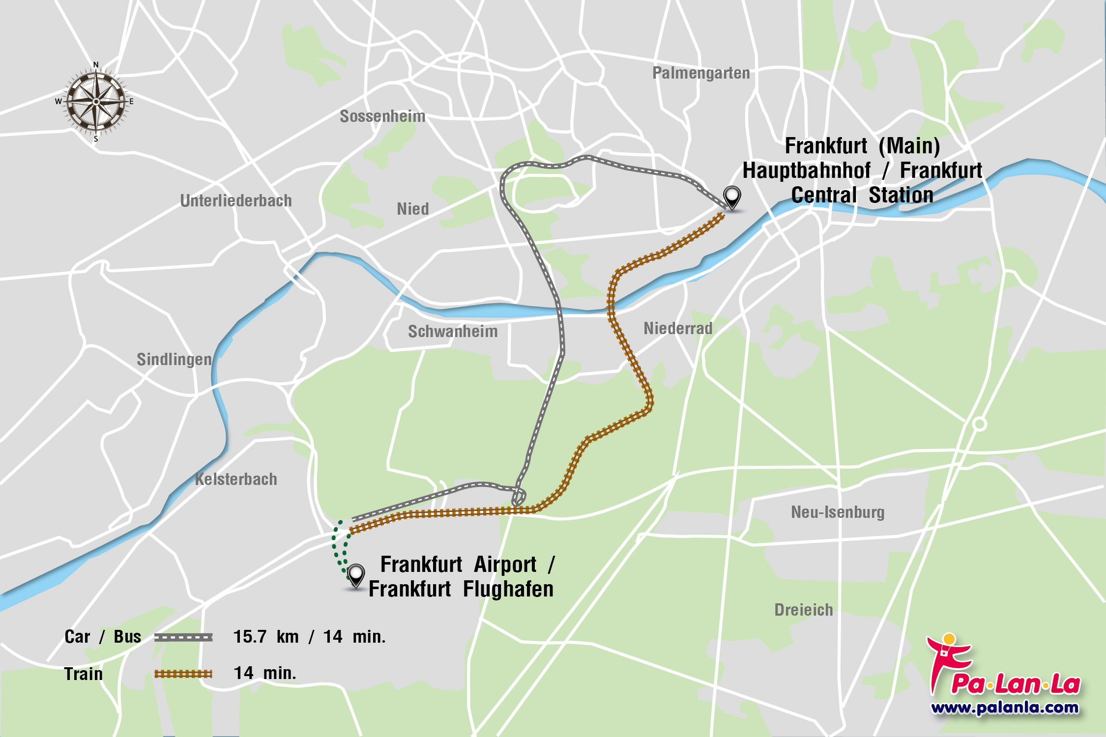 - รถไฟ (Train) จากอาคารผู้โดยสารขาเข้า ให้เดินไปยังสถานี Frankfurt am Main Flughafen Fernbahnhof บริเวณสนามบิน และขึ้นรถไฟด่วนสาย ICE แบบไม่หยุดแวะสถานีย่อย วิ่งยาวตรงไปยังสถานี Frankfurt (Main) Hauptbahnhof ใช้เวลาเดินทางประมาณ 14 นาที