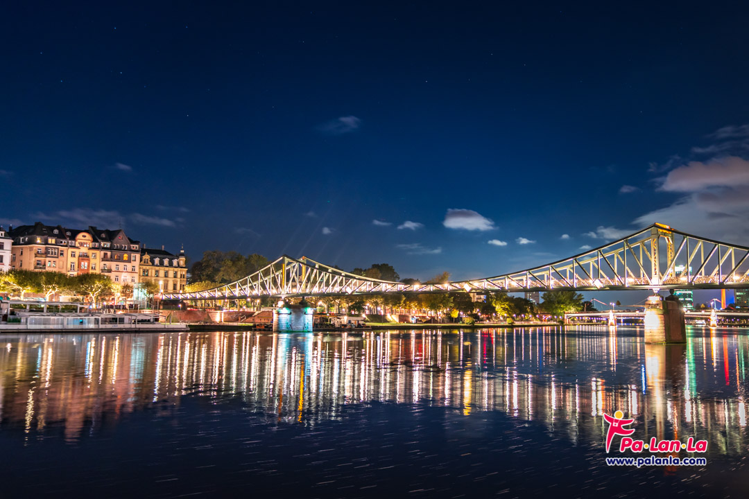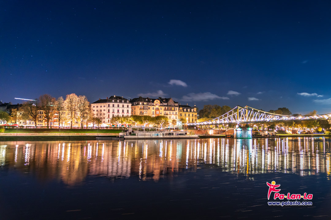 แสงไฟหลากสีจากสะพานและอาคารริมฝั่งแม่น้ำสะท้อนลงบนแม่น้ำไมน์ เกิดความงดงามของทัศนียภาพริมฝั่งแม่น้ำ