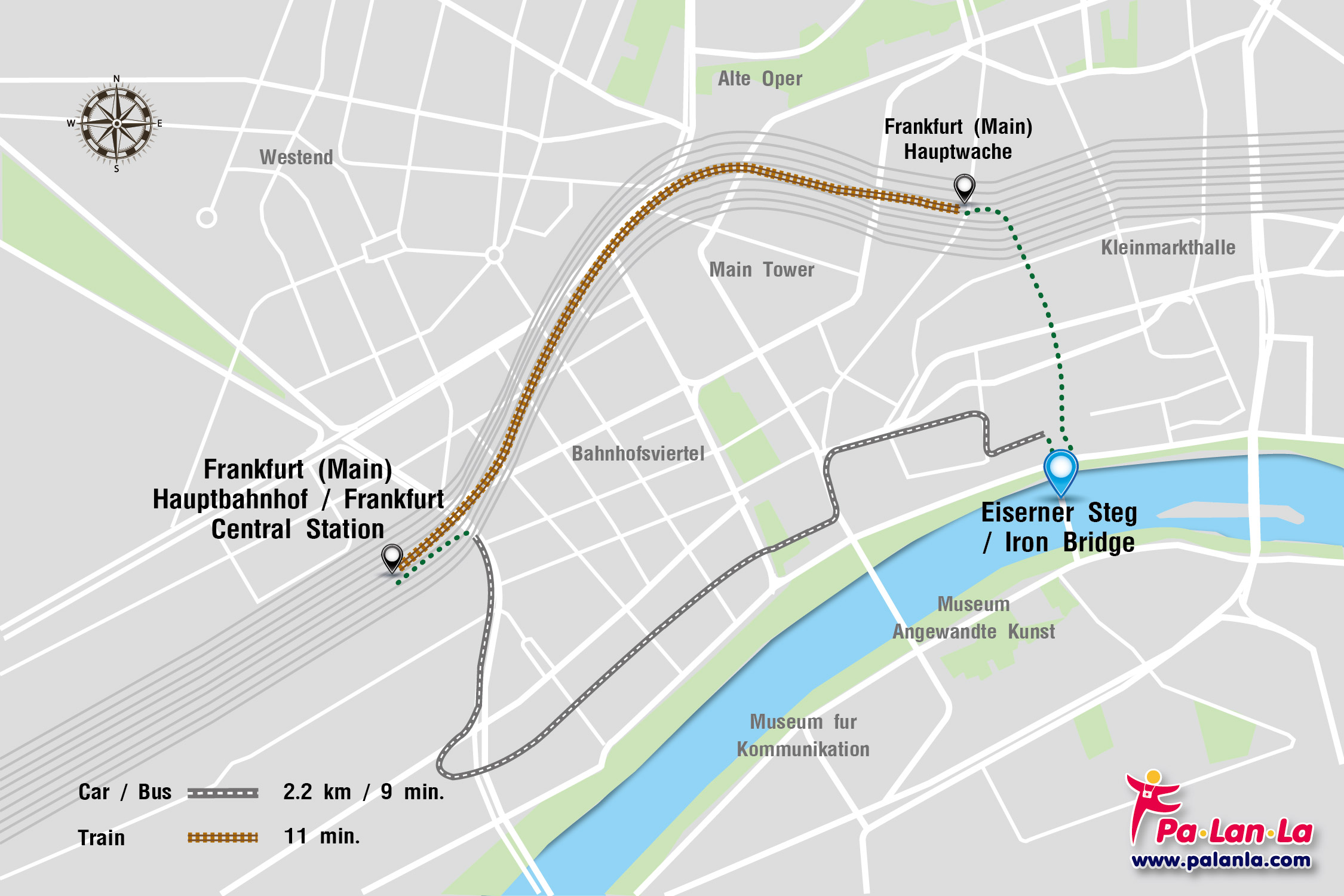 - รถไฟ (Train) จาก Frankfurt (Main) Hauptbahnhof ให้ขึ้นรถไฟสาย S ไปลงสถานี Frankfurt (Main) Hauptwache และเดินต่อไปยัง Eiserner Steg ประมาณ 700 เมตร ใช้เวลาเดินทางโดยรวมประมาณ 11 นาที