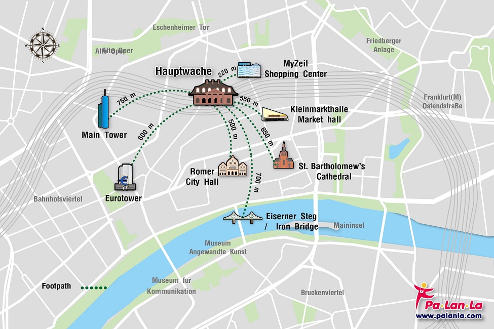 ข้อมูลการเดินทาง : จาก Hauptwache สามารถเดินมายัง Eiserner Steg ได้ในระยะทางประมาณ 700 เมตร ใช้เวลาเดินทางประมาณ 9 นาที