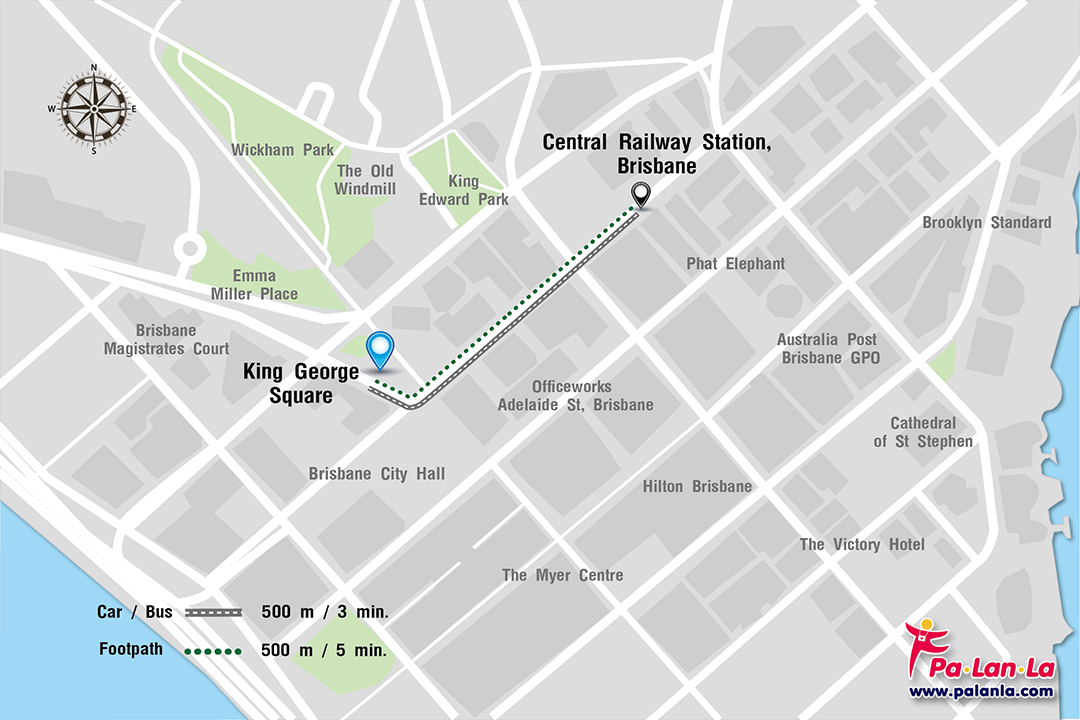 - เดิน (Footpath) จาก Central Station นักท่องเที่ยวสามารถเดินไป King George Square ได้โดยเดินไปตามถนน Ann St โดยใช้เวลาเพียง 5 นาที