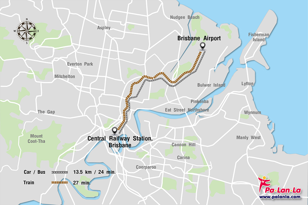 - รถยนต์ (Car) การเดินทางจากสนามบริสเบนไป Brisbane Central Station ซึ่งเป็นศูนย์กลางการคมนาคมของเมืองบริสเบนโดยรถยนต์ โดยใช้เส้นทาง Airport Link นั้นมีระยะทาง 13.5 กิโลเมตร ใช้เวลาเดินทางประมาณ 24 นาที