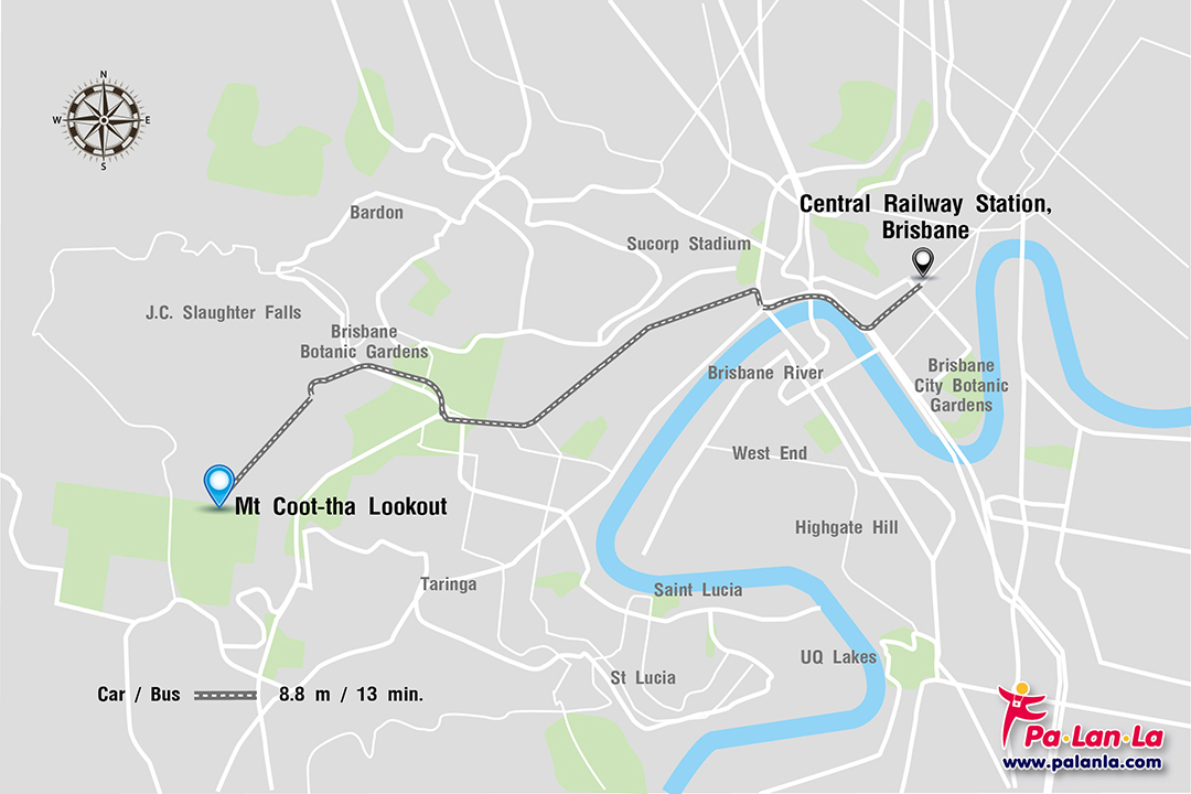 - รถยนต์ (Car) การเดินทางจาก Central Station ไป Mount Coot-tha Lookout โดยใช้ถนนสาย Milton Rd/State Route 32 มีระยะทาง 8.8 กิโลเมตร ใช้เวลาประมาณ 13 นาที