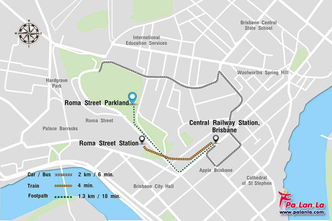 - เดิน (Footpath) จาก Central Station นักท่องเที่ยวสามารถเดินไป Roma Street Parkland ได้โดยเดินไปตามถนน Ann St จะมีระยะทาง 1.3 กิโลเมตร ใช้เวลาประมาณ 18 นาที