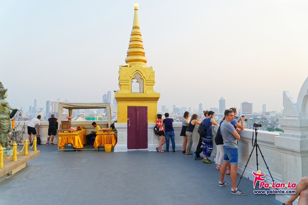 กลุ่มนักท่องเที่ยวต่างชาติที่ขึ้นมาชมวิวทิวทัศน์ของกรุงเทพฯ บนภูเขาทอง
