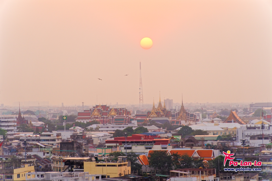 บรรยากาศอันงดงามของกรุงเทพในยามเย็นเมื่อมองจากบนภูเขาทอง