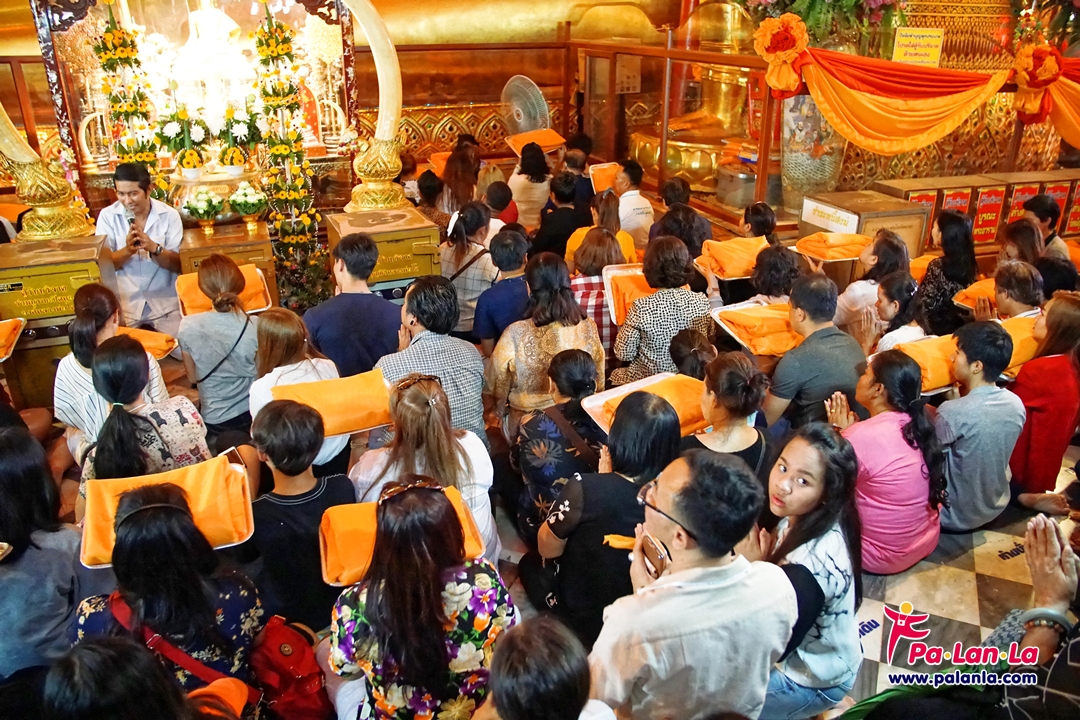 ผู้คนทำพิธีทางศาสนาเพื่อบูชาหลวงพ่อโตภายในพระอุโบสถ