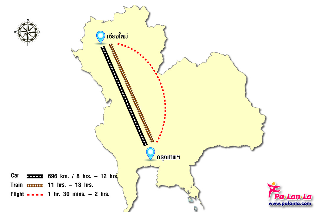 - เครื่องบิน นักท่องเที่ยวสามารถเลือกใช้บริการเที่ยวบินได้ทั้งจาก ท่าอากาศยานดอนเมือง และท่าอากาศยานสุวรรณภูมิ มาลงที่ท่าอากาศยานเชียงใหม่ ซึ่งตั้งอยู่ห่างจากตัวเมืองเชียงใหม่ไปทางใต้ 4 กิโลเมตร โดยใช้เวลาเดินทางเพียง 1.30 – 2 ชั่วโมงเท่านั้น ถือเป็นการเดินทางที่สะดวกสบายและได้รับความนิยมจากนักท่องเที่ยวเป็นอย่างมาก ทั้งนี้ นักท่องเที่ยวสามารถอ่านรายละเอียดเพิ่มเติมเกี่ยวกับสายการบินที่ให้บริการ รวมถึงตารางเวลาเพิ่มเติมได้ที่ http://chiangmaiairportthai.com/