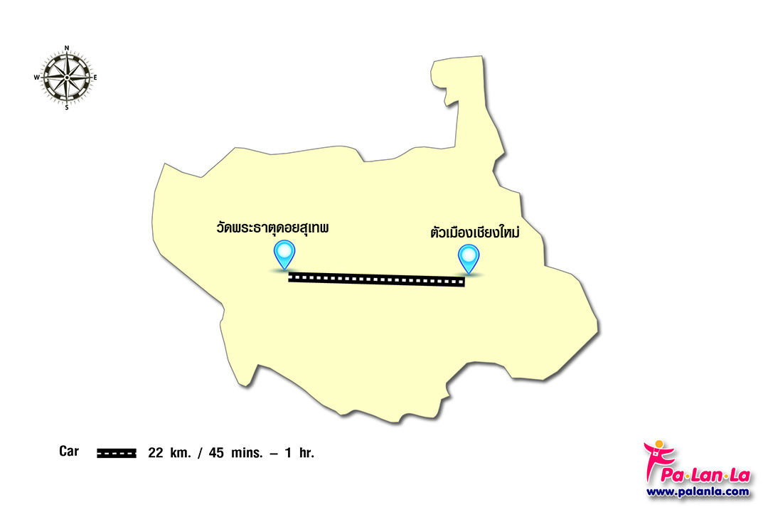 และเมื่อนักท่องเที่ยวเดินทางมาถึงเมืองเชียงใหม่แล้ว สามารถเดินทางต่อไปยังวัดพระธาตุดอยสุเทพซึ่งตั้งอยู่ทางตะวันออกของตัวเมืองเชียงใหม่ ห่างออกไปประมาณ 22 กิโลเมตร โดยสามารถเลือกเดินทางได้หลายวิธี อาทิ