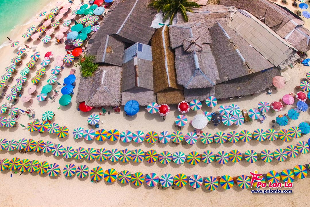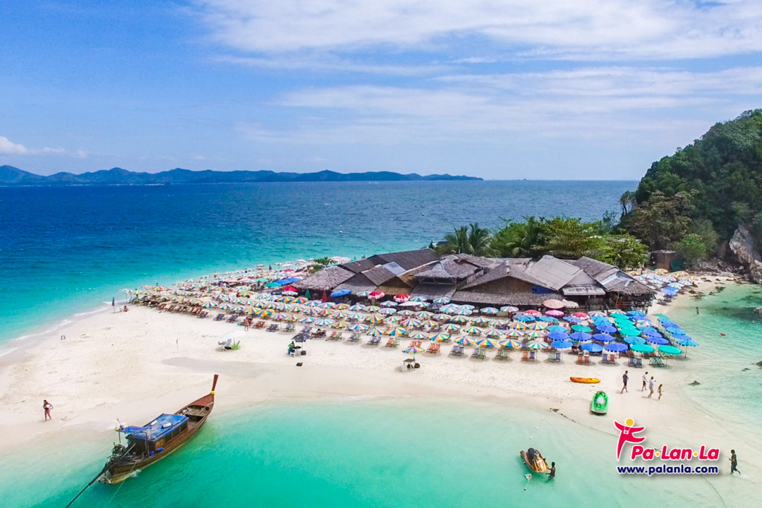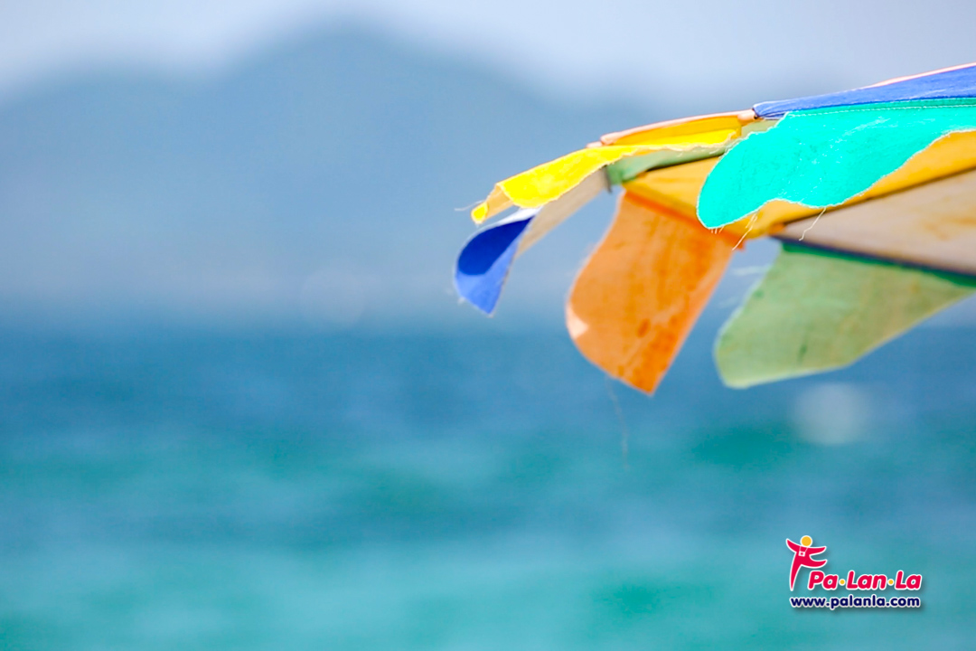 ร่มหลากสีสันสวยงามที่ตัดกับพื้นหาดทรายขาวของเกาะไข่