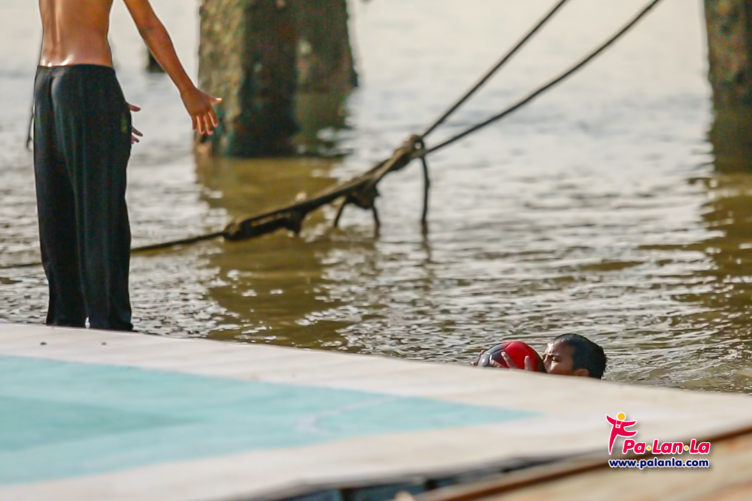 มีคนกระโดดลงไปเก็บ และคนคอยรับลูกฟุตบอลอยู่บนฝั่ง