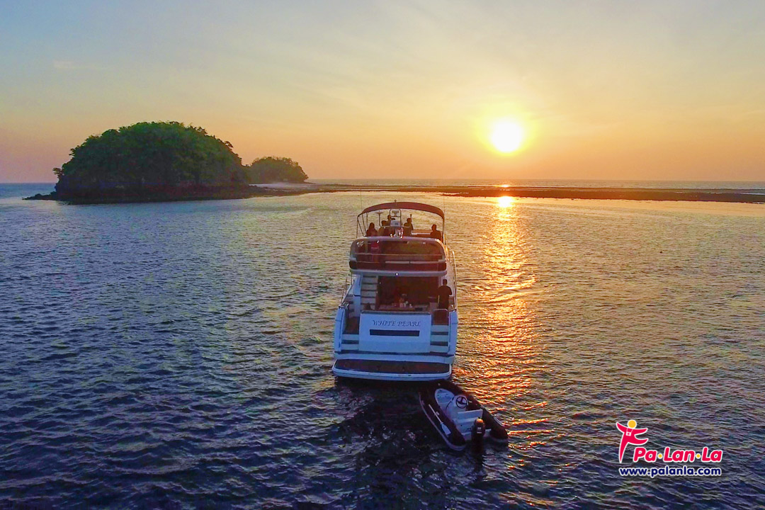 แสงสีทองเหนือท้องทะเลกับเรือของนักท่องเที่ยวที่มุ่งหน้าไปยังจุดหมาย