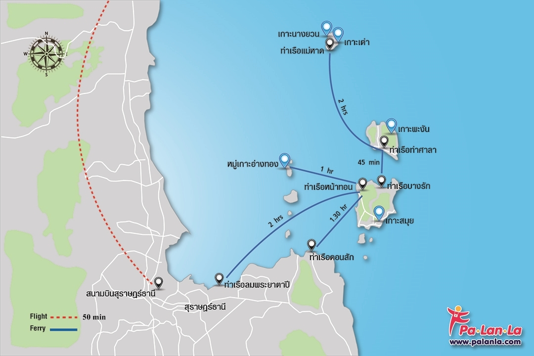 - เครื่องบิน จากกรุงเทพมหานคร หากนักท่องเที่ยวต้องการเดินทางไปยังเกาะสมุยด้วย เที่ยวบินตรง สามารถใช้บริการเที่ยวบินของสายการบินบางกอกแอร์เวย์ ซึ่งมีเที่ยวบินให้บริการทุกวัน วันละ 17 เที่ยวบินจากสนามบินสุวรรภูมิ ใช้เวลาเดินทางประมาณ 1 ชั่วโมง 5 นาที หรืออีกทางเลือกหนึ่ง นักท่องเที่ยวสามารถใช้บริการสายการบินอื่นๆที่มีเที่ยวบินไปยังจ.สุราษฏร์ธานี จากนั้นซื้อแพ็คเกจของบริษัทรถตู้หรือเรือเฟอรี่ในราคารวมเที่ยวละ 400 บาทสำหรับค่าตั๋วรถโดยสารไปยังท่าเรือและตั๋วเรือเฟอรี่ไปยังเกาะสมุย