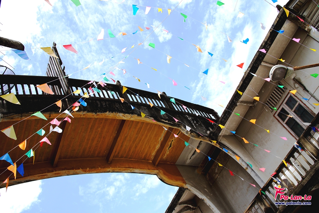 ธงสีสันสดใสตัดกับสีของท้องฟ้าเหนือสะพานโค้ง