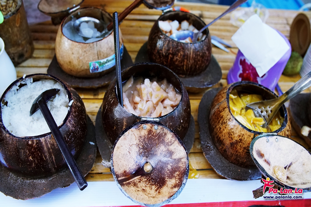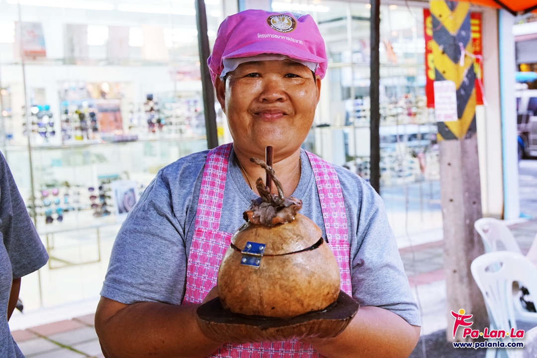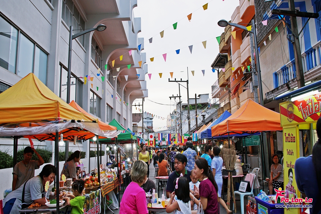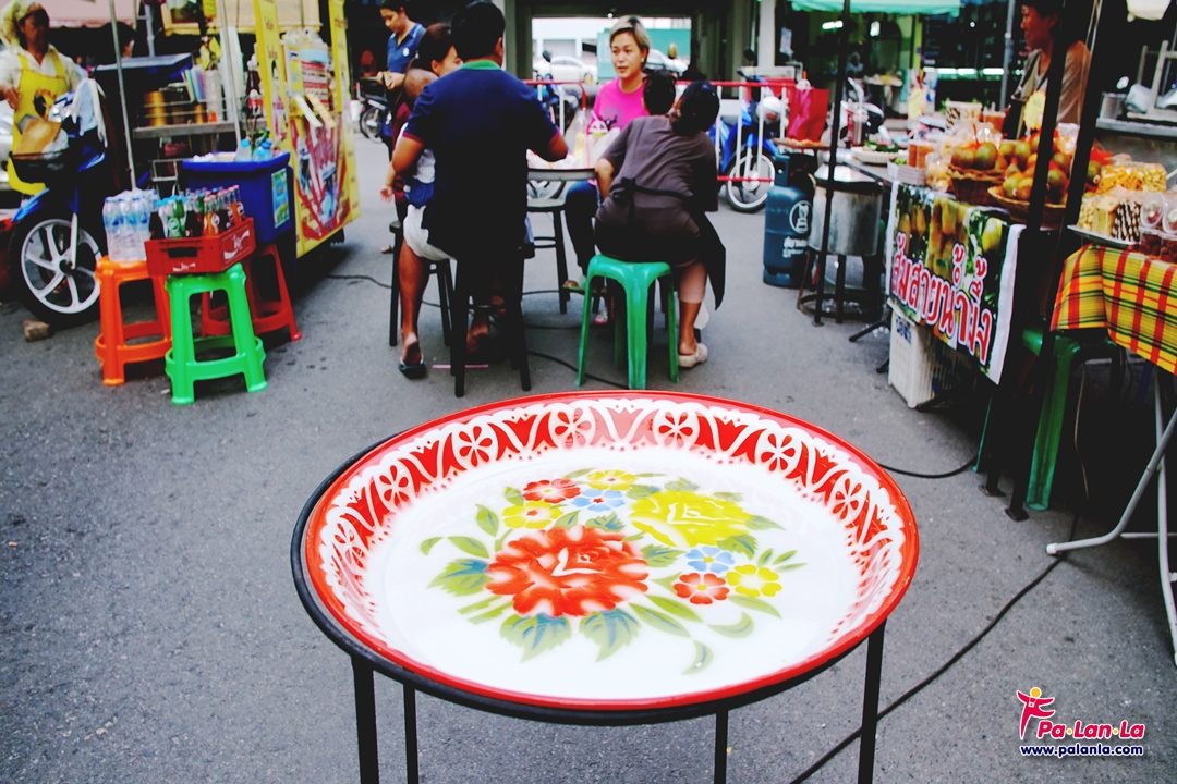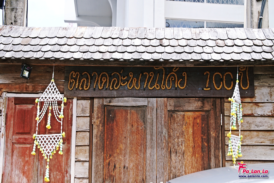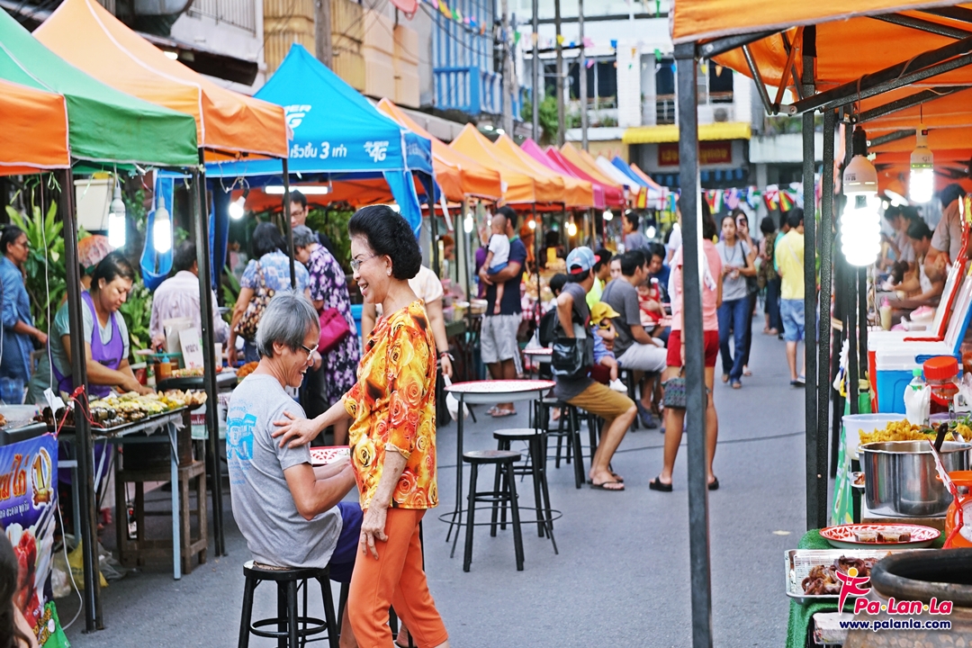 ร้านขายของกินเรียงรายอยู่สองข้างทาง พร้อมมีพื้นที่ตรงกลางให้สามารถนั่งทานได้