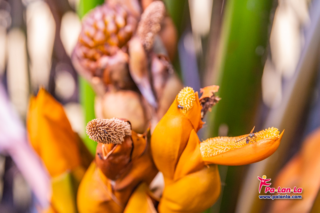 ดอกจาก ออกดอกเป็นช่อแบบกระจุกแน่นระหว่างกาบใบ