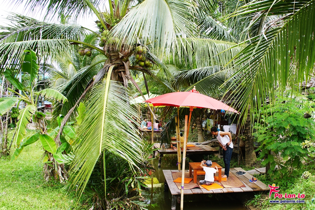ที่นั่งยื่นลงไปในคลองให้นั่งรับประทานอาหารได้ บรรยากาศธรรมชาติท่ามกลางสวนมะพร้าว