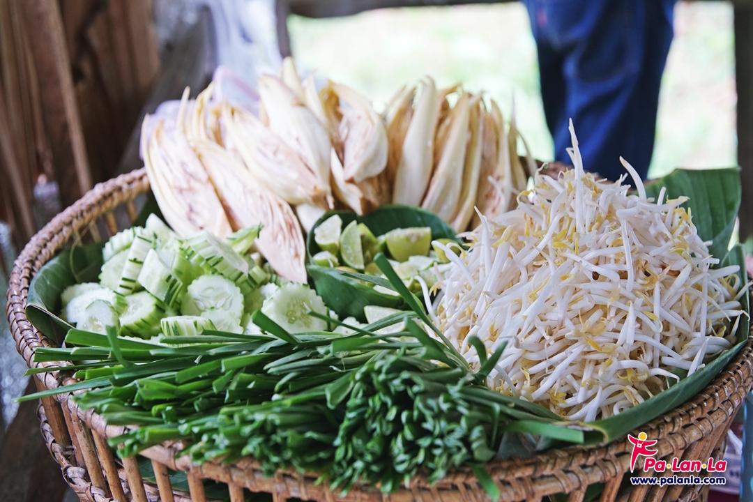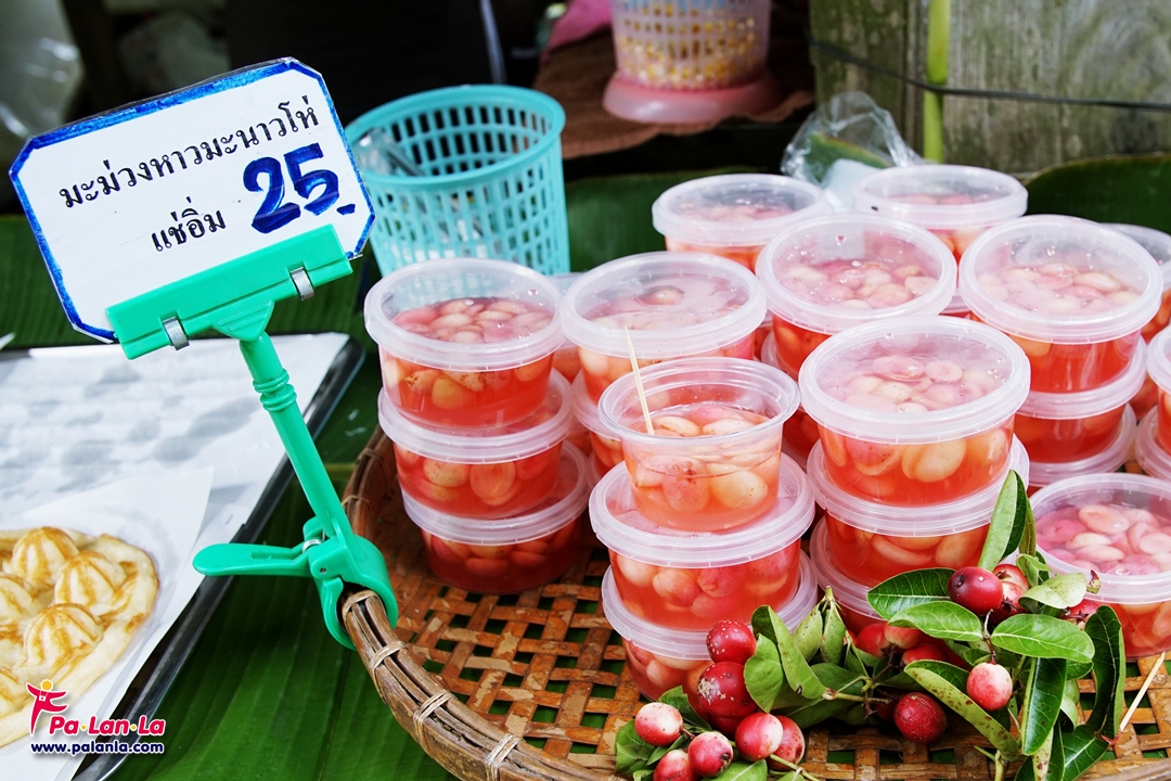 ภายในตลาดน้ำ จะเป็นแผงลอยจากชาวบ้านชุมชนใกล้ๆ มาตั้งซุ้มขายของหลากหลาย และซุ้มแผงลอยภายในสวนของกำนันสาว เดินข้ามสะพานเข้าไปวนรอบสวนกำนันที่ขายของแล้วข้ามสะพานออกมาทางวัด จะพบกับร้านขนมจีนชายคลองแม่มณฑา เป็นร้านที่ลูกค้าสามารถตักเองและมีน้ำยาให้เลือกหลากหลาย ไม่ว่าจะเป็นน้ำพริกน้ำยา แกงป่า หรือ แกงไก่