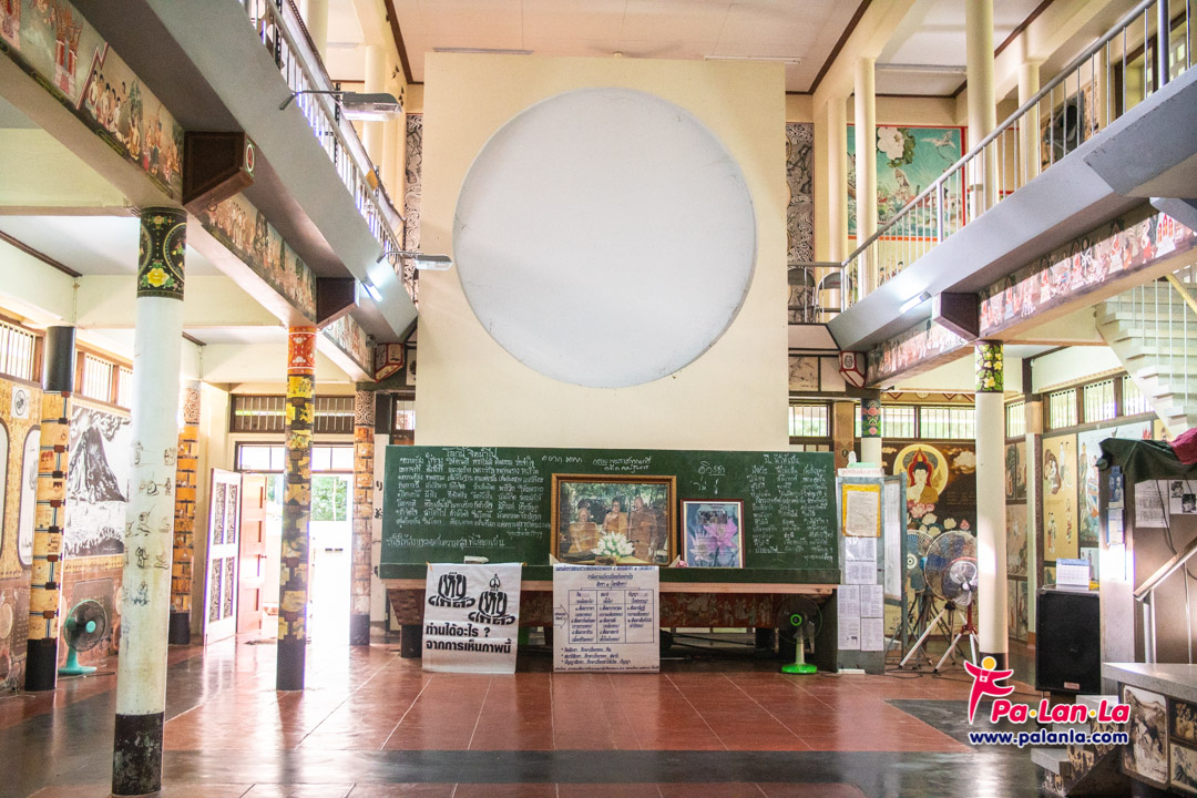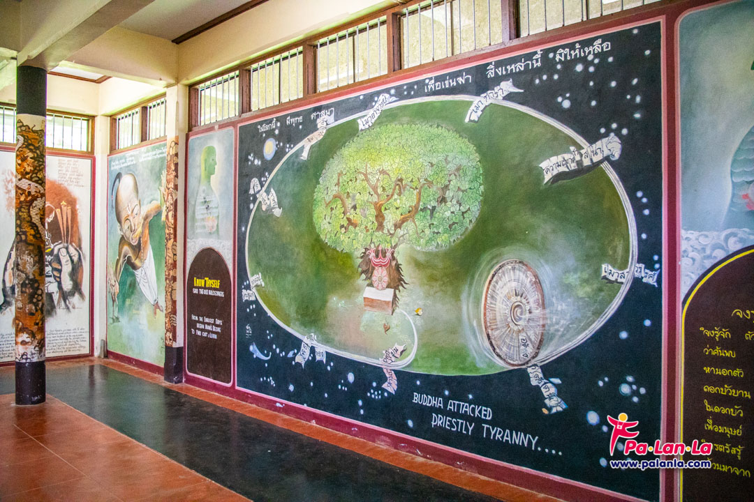 ข้างฝาผนังในโรงมหรสพทางวิญญาณ เต็มไปด้วยภาพวาดและคติธรรม