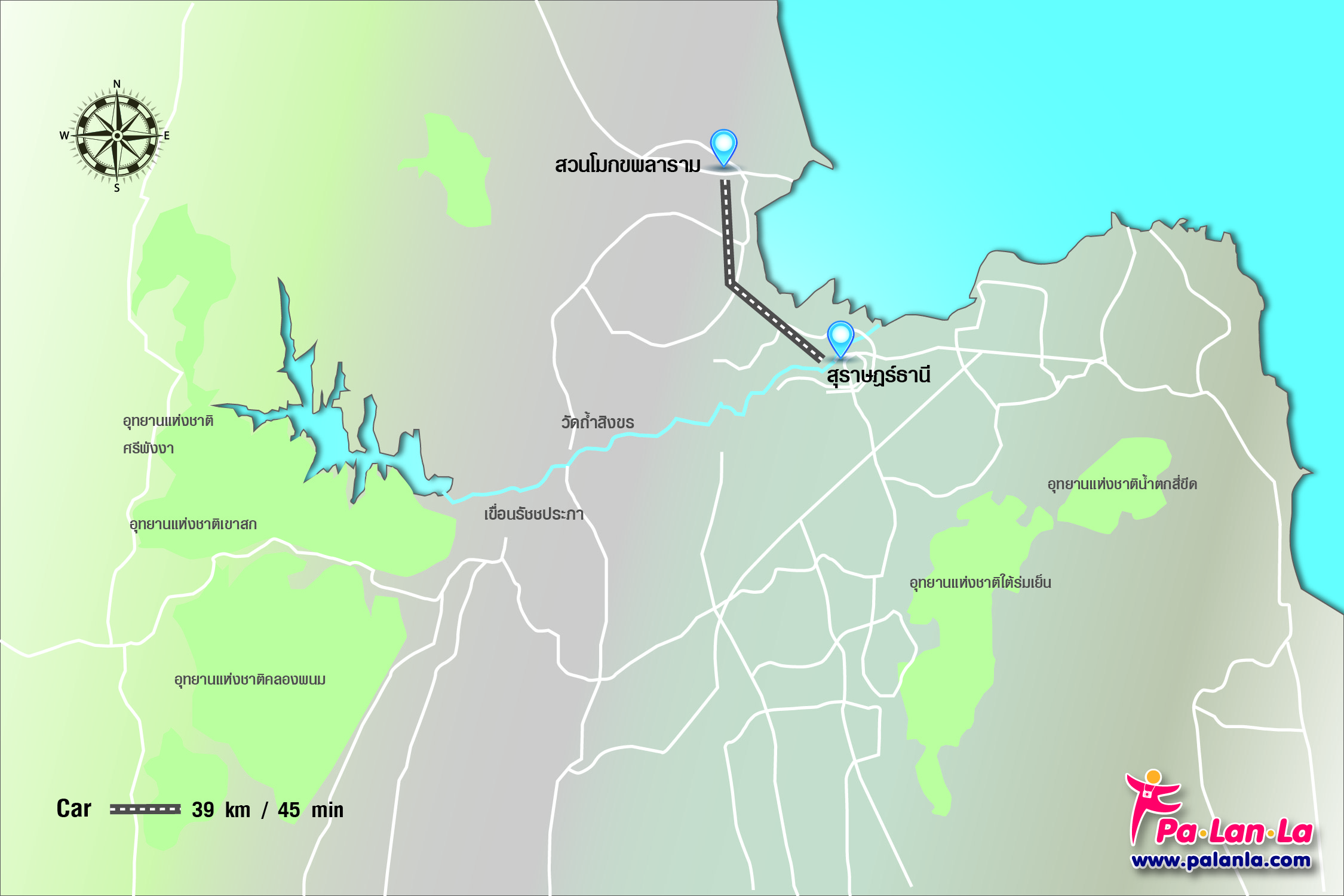 - โดยเครื่องบิน มีบริการสายการบินจากกรุงเทพฯ ไปสุราษฎร์ธานีหลายเที่ยวบินต่อวัน ทั้งจากสนามบินดอนเมืองและสุวรรณภูมิ บินไปลงยังสนามบินสุราษฎร์ธานีและสนามบินสมุย โดยใช้เวลาเดินทางประมาณ 50 นาที