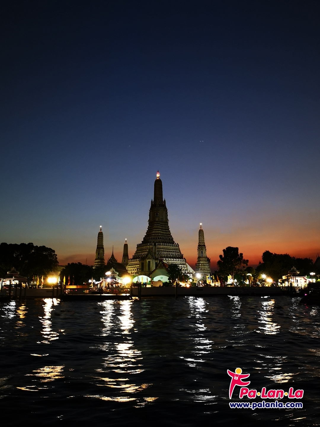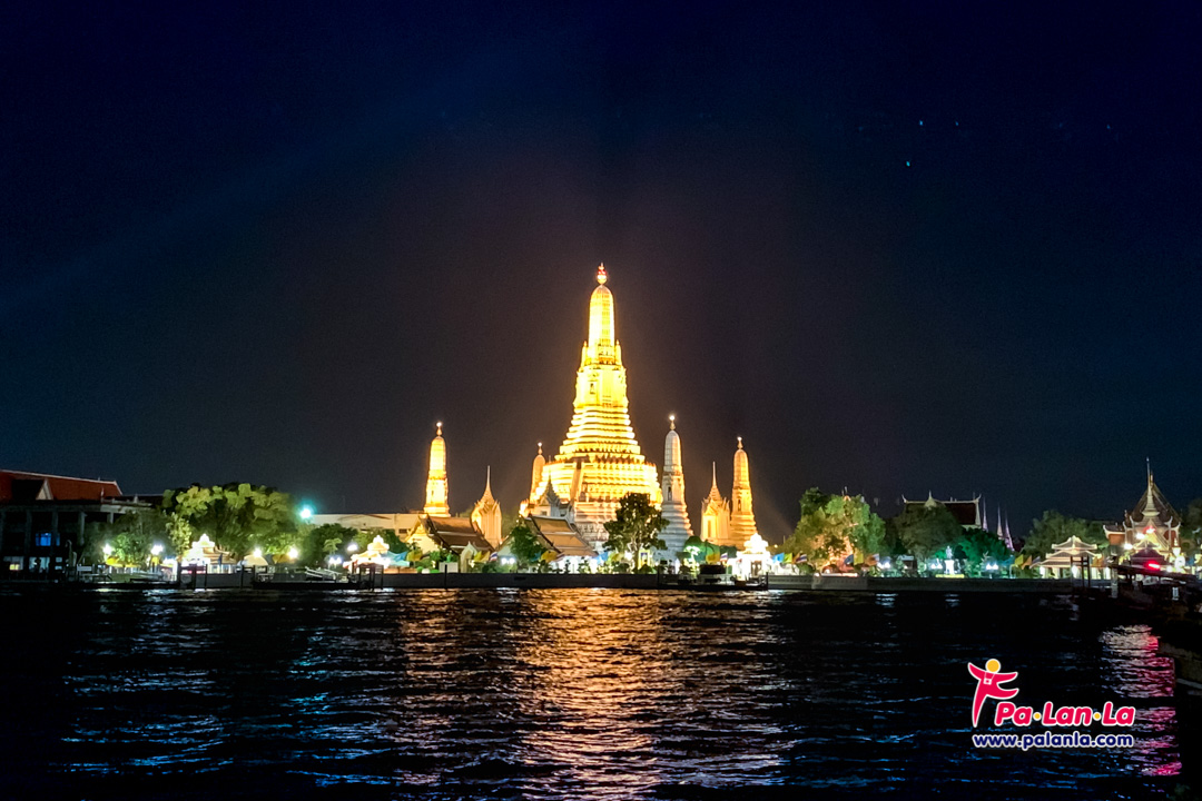 อีกหนึ่งมุมที่จะได้เห็นความงดงามของพระปรางค์วัดอรุณฯ คือมุมมองจากบนเรือดินเนอร์ครุยส์ที่ล่องไปตามแม่น้ำเจ้าพระยา ซึ่งจะนำนักท่องเที่ยวล่องเรือชมทัศนียภาพยามค่ำคืนของสถานที่สำคัญเชิงประวัติศาสตร์ และศิลปวัฒนธรรมริมสองฝั่งแม่น้ำเจ้าพระยาที่มีการตกแต่งประดับประดาด้วยแสง ไฟสีสันงดงาม ซึ่งเส้นทางที่เรือจะแล่นผ่านนั้น แน่นอนว่าจุดหนึ่งคือ วัดอรุณฯ ที่นักท่องเที่ยวจะมีโอกาสได้ถ่ายภาพขององค์พระปรางค์ยามค่ำคืนในมุมมองชัดเจน งดงาม