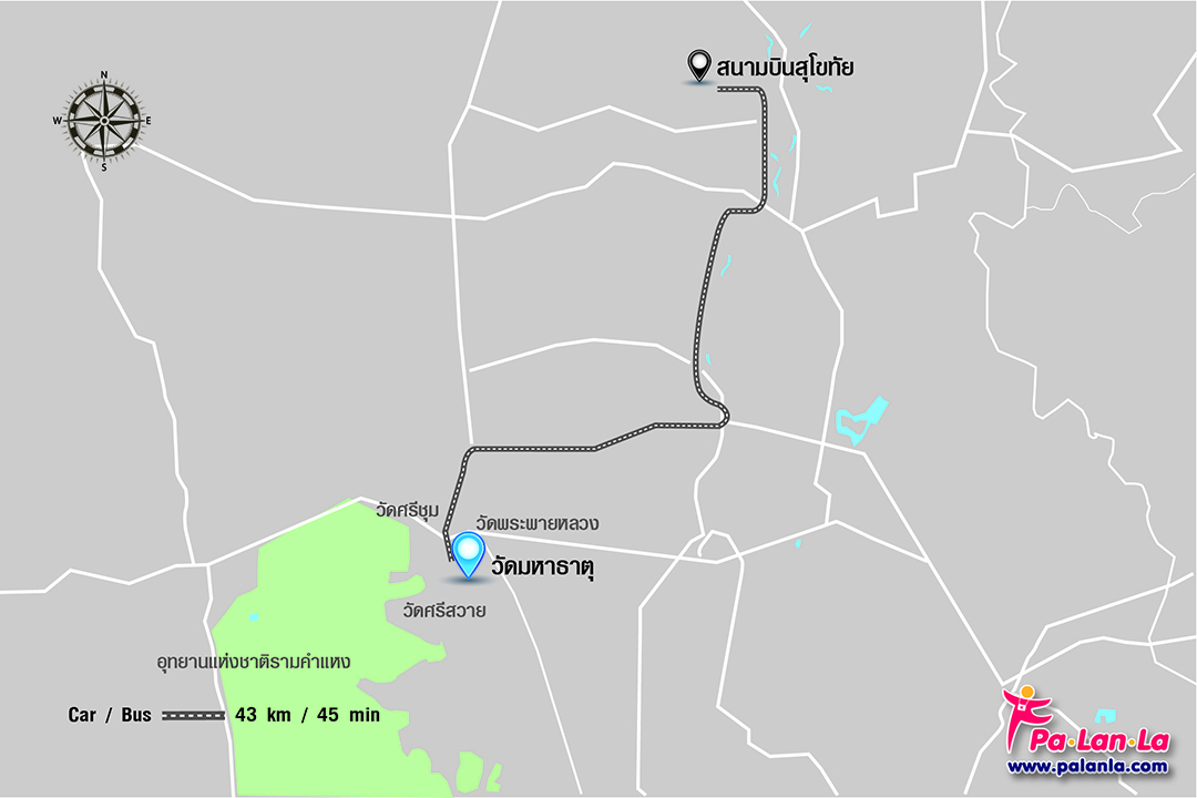 - โดยเครื่องบิน มีบริการสายการบินจากกรุงเทพฯ ที่มีเที่ยวบินตรงไปสุโขทัยทุกวัน หรือสามารถบินจากกรุงเทพฯ ไปลงที่จังหวัดพิษณุโลก จากนั้นให้เดินทางต่อโดยรถประจำทางไปสุโขทัยอีกประมาณ 118 กิโลเมตร
