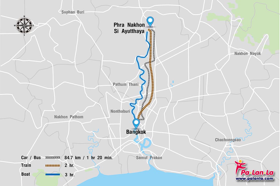 - รถยนต์ จากกรุงเทพมหานคร สามารถเดินทางไปยังจังหวัดอยุธยาได้หลายเส้นทาง ระยะทางประมาณ 84.7 กิโลเมตร ใช้เวลาประมาณ 1 ชั่วโมง 20 นาที ได้แก่