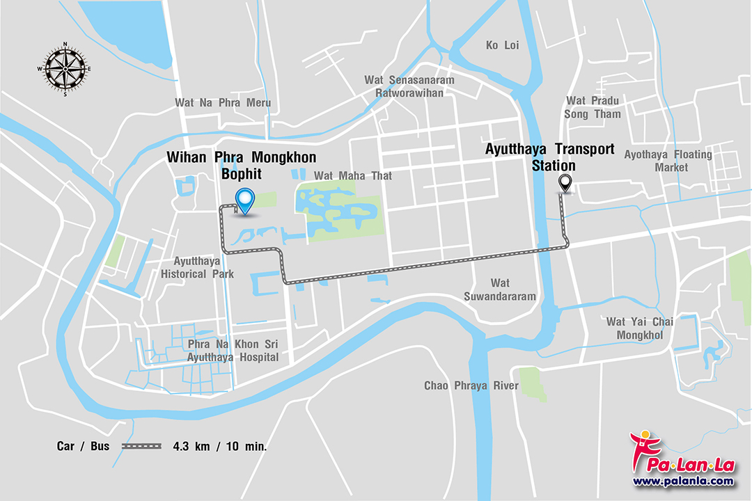 - รถยนต์ จากสถานีขนส่ง จังหวัดอยุธยา ไปยังวิหารพระมงคลบพิตร ระยะทางประมาณ 4.3 กิโลเมตร ใช้เวลาประมาณ 10 นาที
