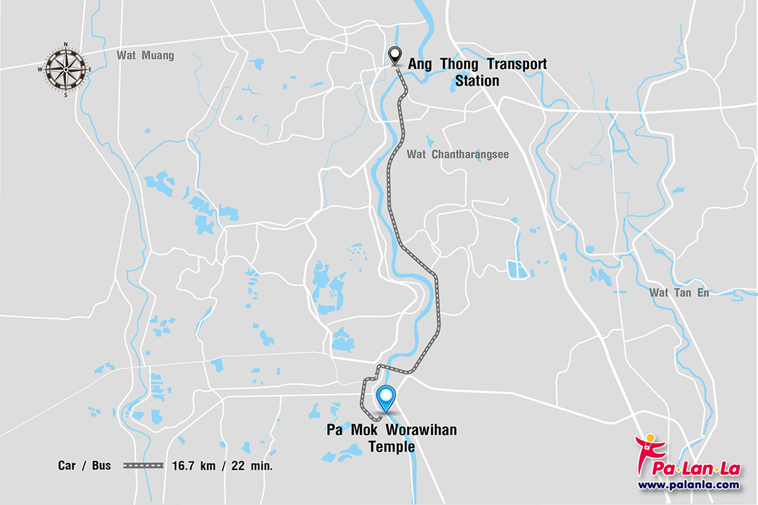 - รถยนต์ จากสถานีขนส่ง จังหวัดอ่างทอง ไปยังวัดป่าโมกวรวิหารระยะทางประมาณ 16.7 กิโลเมตร ใช้เวลาประมาณ 22 นาที
