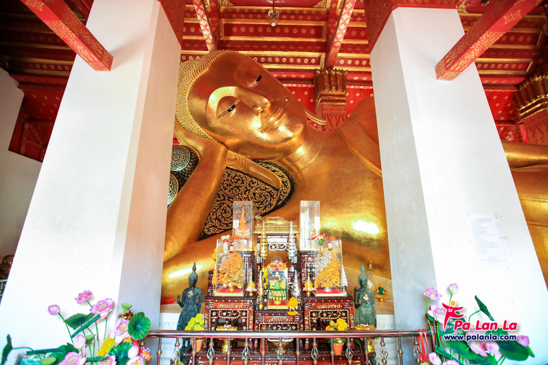พระพุทธไสยาสน์ เป็นปูนปั้นลงรักปิดทองทั้งองค์ ตะแคงขวาแบบสีหไสยา มีความยาวจากพระเมาลีถึงพระบาท 22 เมตร