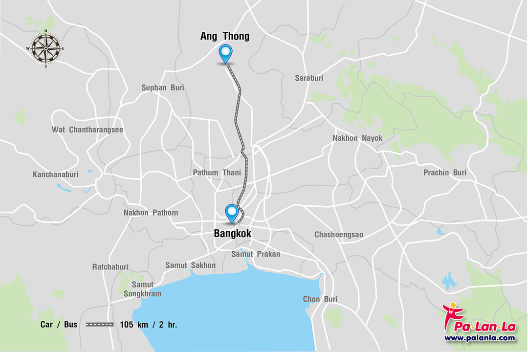 - รถยนต์ จากกรุงเทพมหานครไปยังจังหวัดอ่างทอง ระยะทางประมาณ 105 กิโลเมตร ใช้เวลาประมาณ 2 ชั่วโมง โดยสามารถเดินทางได้หลายเส้นทาง คือ