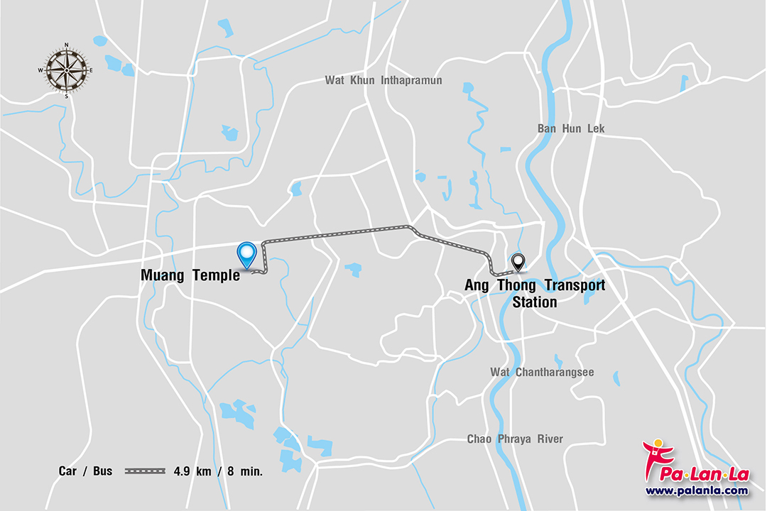 - รถยนต์ จากสถานีขนส่งจังหวัดอ่างทอง ไปยังวัดม่วง ระยะทางประมาณ 4.9 กิโลเมตร ใช้เวลาประมาณ 8 นาที
