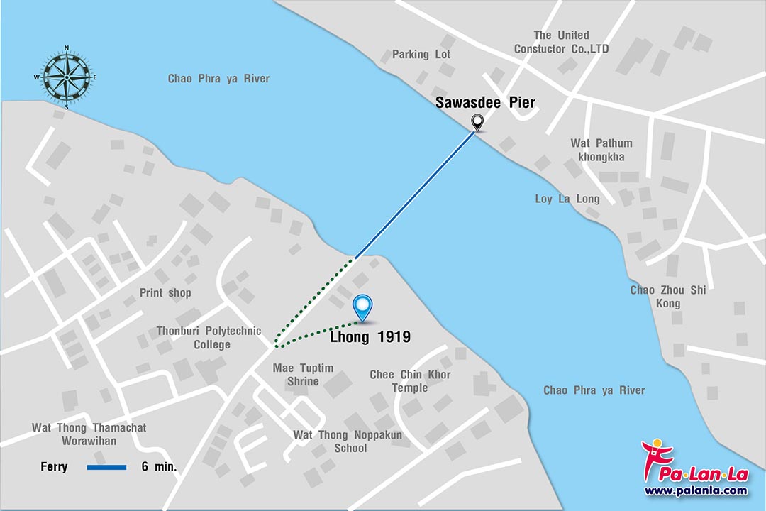 - เรือ ท่าเรือด่วนที่ใกล้กับล้ง 1919 คือ ท่าเรือสวัสดี จากท่าเรือสวัสดี นั่งเรือข้ามฟากมาลงที่ท่าเรือวัดทองธรรมชาติ จากนั้นเดินมาล้ง 1919 ระยะทางประมาณ 350 เมตร ใช้เวลาประมาณ 6 นาที