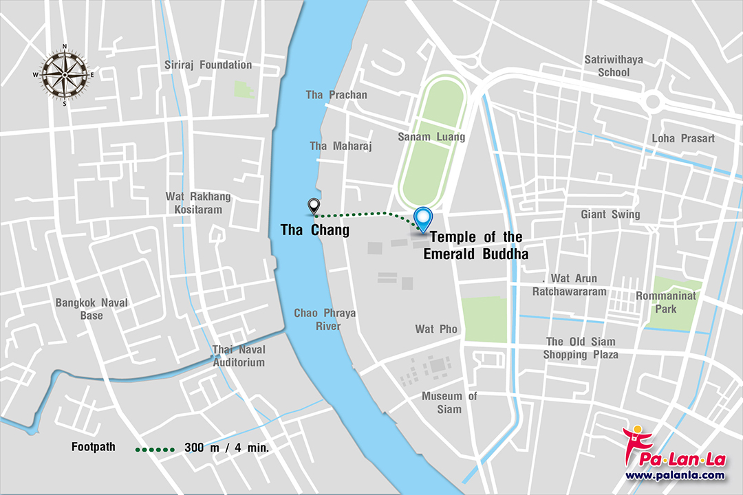 - เรือ นักท่องเที่ยวสามารถเดินทางโดยเรือ จากท่าช้าง เดินมาวัดพระศรีรัตนศาสดารามราชวรวิหาร ระยะทางประมาณ 300 เมตร ใช้เวลาประมาณ 4 นาที