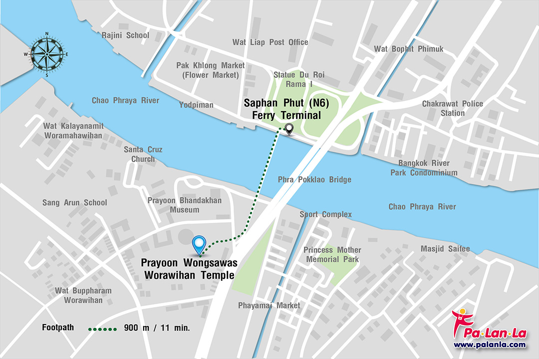 - เรือ นักท่องเที่ยวสามารถเดินทางโดยเรือ จากท่าสะพานพุทธ เดินมาวัดประยุรวงศาวาสวรวิหารระยะทางประมาณ 900 เมตร ใช้เวลาประมาณ 11 นาที
