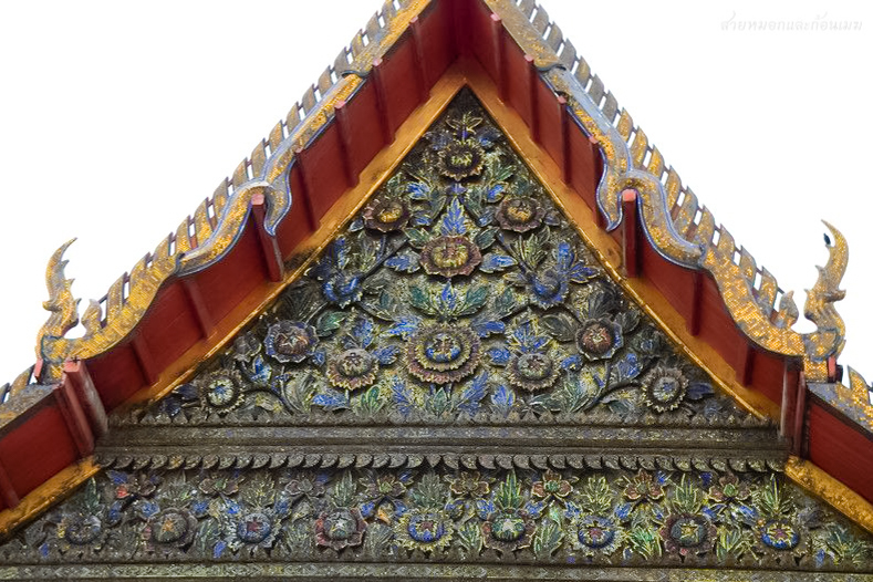 ลวดลายตกแต่งบริเวณหน้าบัน ขอบคุณรูปภาพจาก https://www.watprayoon.com