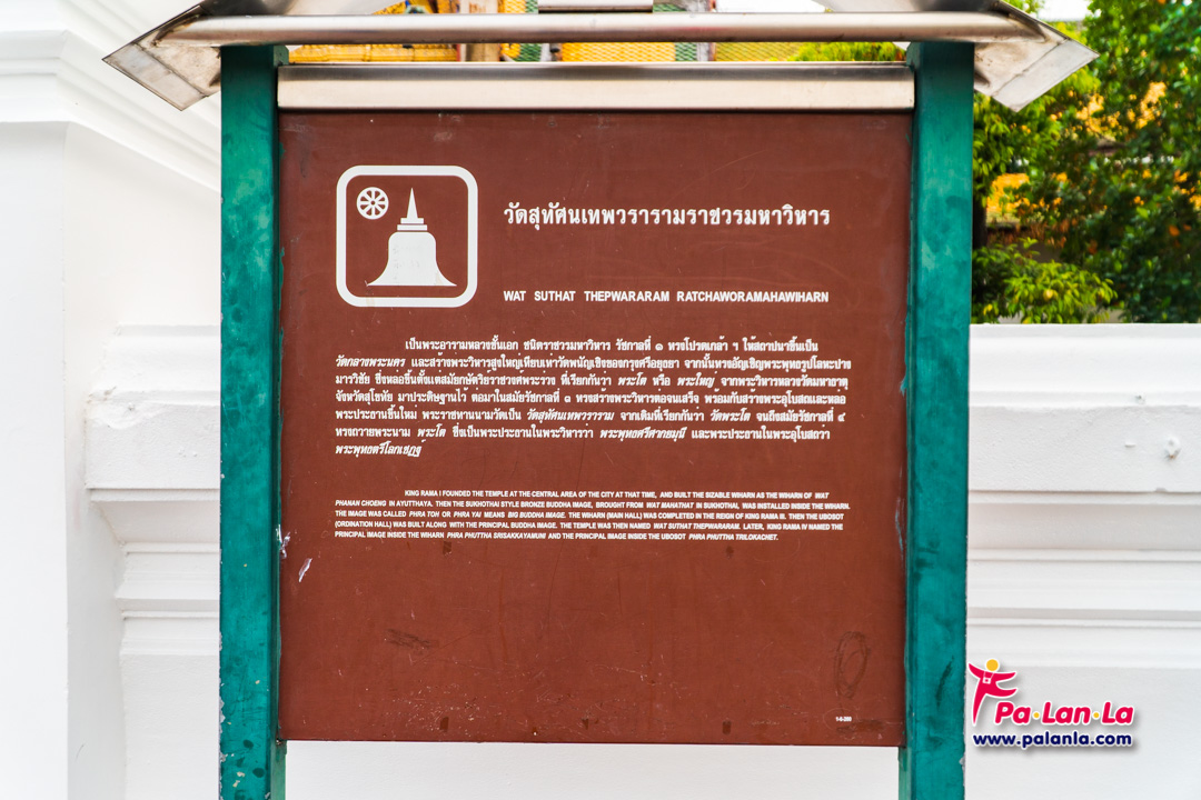 แผ่นป้ายระบุข้อมูลประวัติความเป็นมาของวัดสุทัศนเทพวรารามราชวรมหาวิหาร