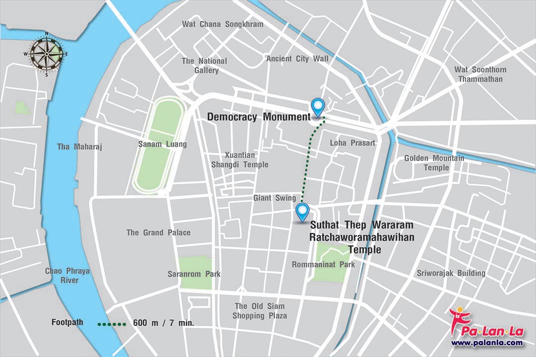 - เดิน นักท่องเที่ยวสามารถเดินจากอนุสาวรีย์ประชาธิปไตย มายังวัดสุทัศนเทพวรารามราชวรมหาวิหารระยะทางประมาณ 600 เมตร ใช้เวลาประมาณ 7 นาที