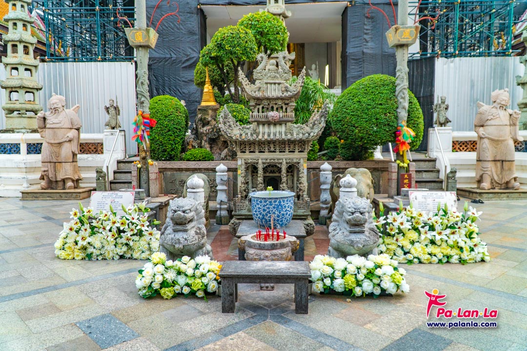 เก๋งจีนหน้าพระวิหาร เป็นเครื่องศิลาสลัก มีลักษณะเป็นปราสาทแบบจีน ตั้งอยู่บนตั่งขาสิงห์ ล้อมรอบด้วยหินสลักรูปสัตว์