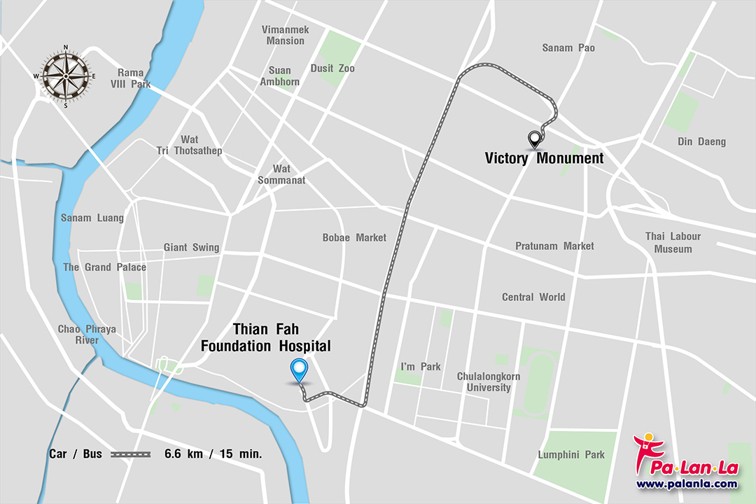 - รถยนต์ นักท่องเที่ยวสามารถเดินทางจากอนุสาวรีย์ชัยสมรภูมิไปยังโรงพยาบาลเทียนฟ้ามูลนิธิ ระยะทางประมาณ 6.6 กิโลเมตร ใช้เวลาประมาณ 15 นาที ทั้งนี้ขึ้นอยู่กับสภาพการจราจร