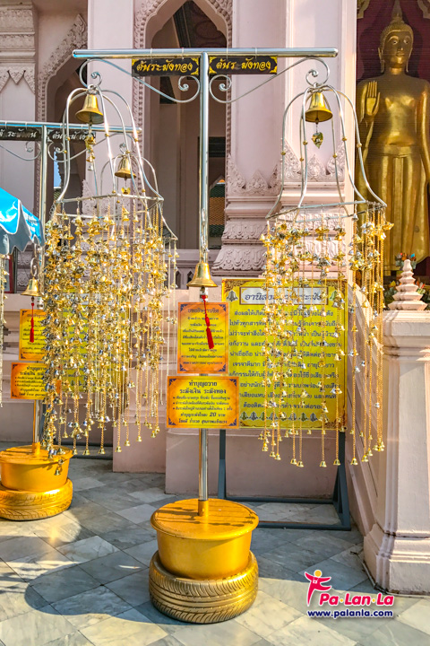 เชื่อกันว่าอานิสงส์จากการถวายระฆังจะทำให้มีชื่อเสียง ทำสิ่งใดก็เจริญก้าวหน้า มีความจำดีและอายุยืน (รูปซ้าย) หลวงพ่อพระพุทธไสยาสน์องค์ใหญ่ (รูปขวา)