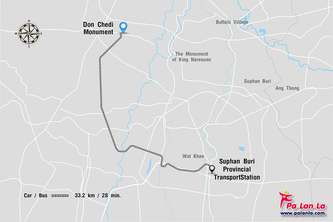 - รถยนต์ จากอนุสาวรีย์ชัยสมรภูมิมุ่งสู่ตัวเมืองสุพรรณบุรี ระยะทางประมาณ 105 กิโลเมตร ใช้เวลาเดินทางประมาณ 1 ชั่วโมง 15 นาที ทั้งนี้ขึ้นอยู่กับสภาพการจราจร