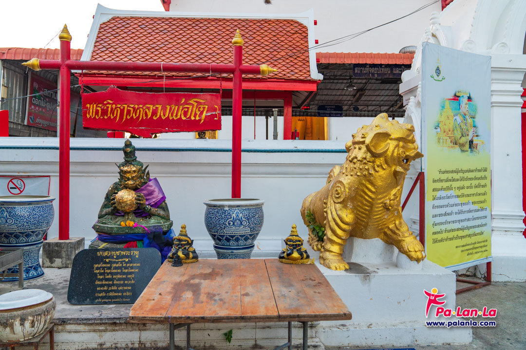 ด้านหน้าพระวิหารหลวงพ่อโตจะมีพระราหูและสิงโตทองให้บูชา