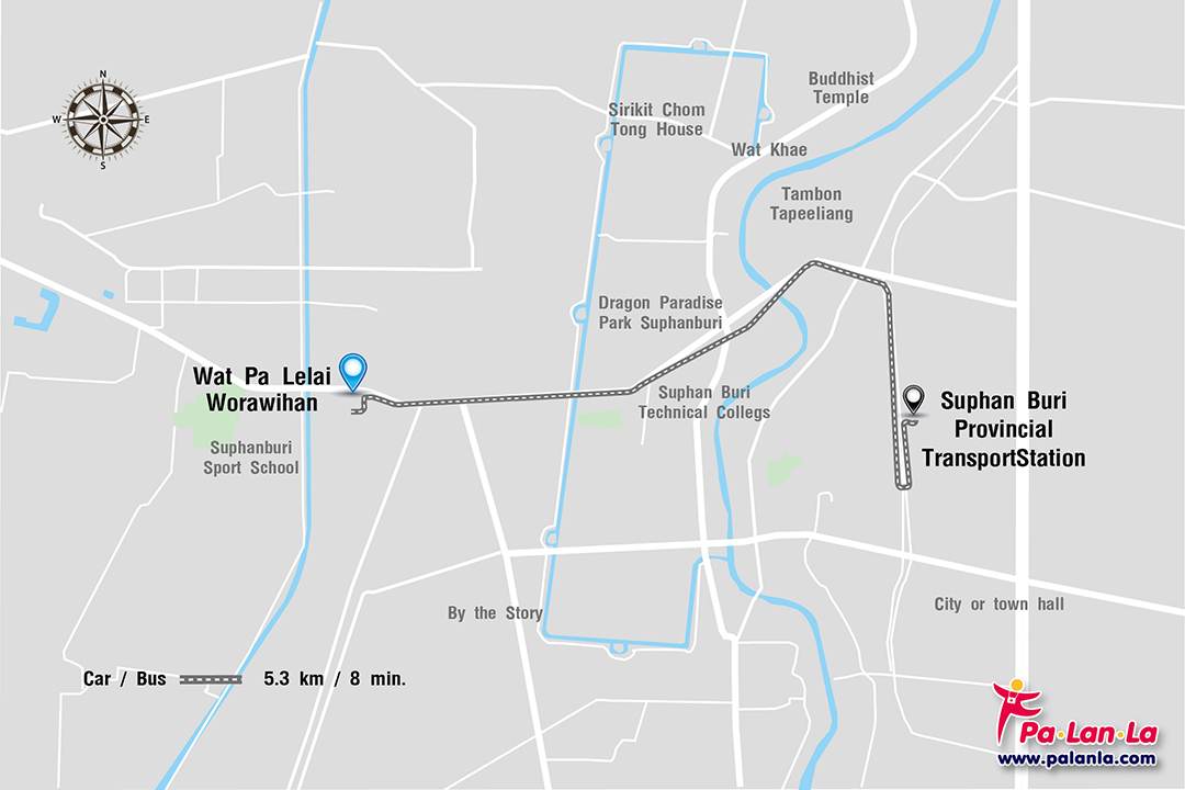 - รถยนต์ จากอนุสาวรีย์ชัยสมรภูมิมุ่งสู่ตัวเมืองสุพรรณบุรี ระยะทางประมาณ 105 กิโลเมตร ใช้เวลาเดินทางประมาณ 1 ชั่วโมง 15 นาที ทั้งนี้ขึ้นอยู่กับสภาพการจราจร