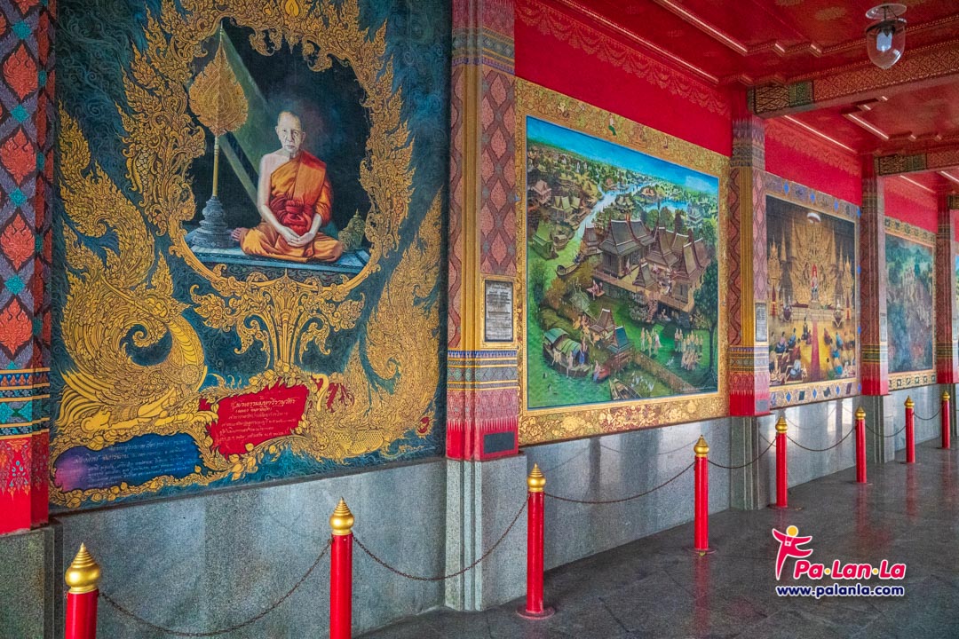 จิตรกรรมฝาผนังอดีตเจ้าอาวาสพระธรรมมหาวีรานุวัตร ผู้ดำเนินการสร้างพระวิหารคต และภาพเรื่องราวของขุนช้าง-ขุนแผน