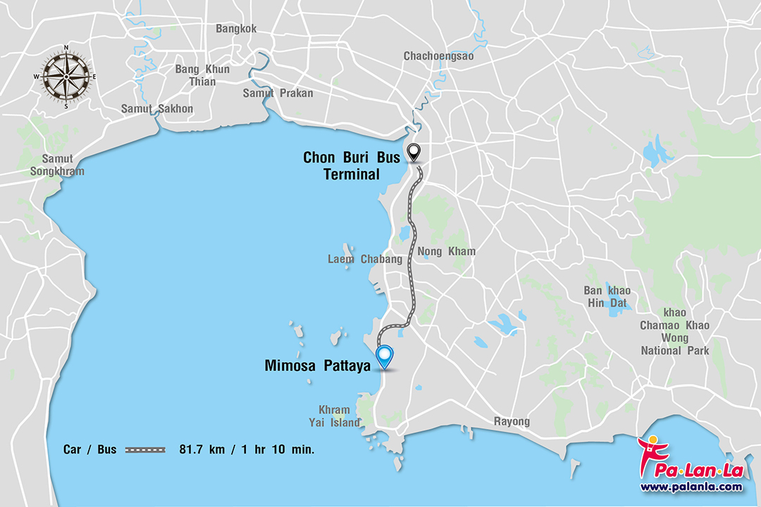 - รถยนต์ นักท่องเที่ยวสามารถเดินทางโดยรถยนต์จากบริเวณสถานีขนส่งชลบุรี ไปยังมิโมซ่า ระยะทางประมาณ 81.7 กิโลเมตร ใช้เวลาเดินทางประมาณ 1 ชั่วโมง 10 นาที