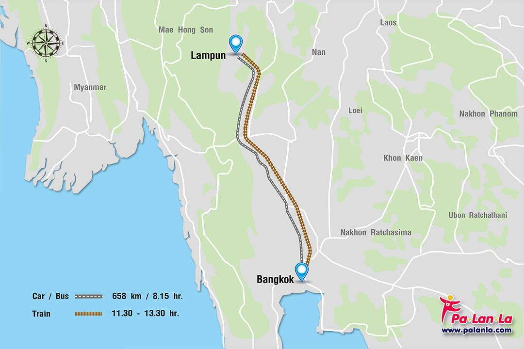 - รถยนต์ (Car/ Bus) การเดินทางโดยรถยนต์จากกรุงเทพฯ ไปจังหวัดลำพูน มีระยะทาง 658 กิโลเมตร ใช้เวลาเดินทางประมาณ 8 ชั่วโมง 15 นาที