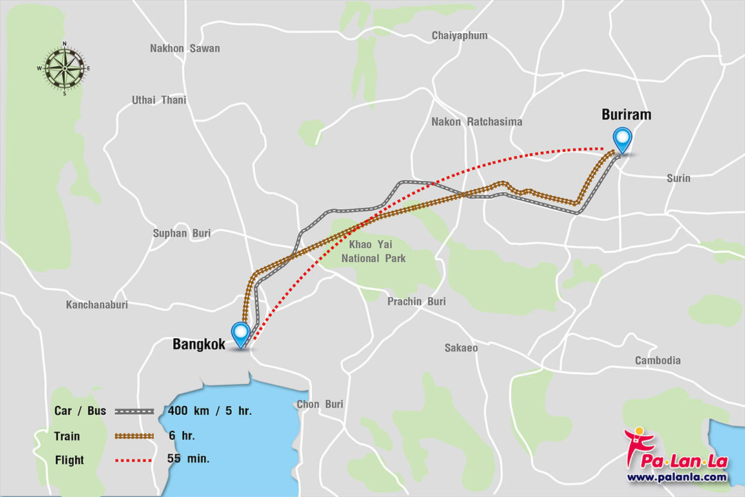 - เครื่องบิน (Flight) การเดินทางโดยเครื่องบินจากสนามบินดอนเมืองและสุวรรณภูมิ ไปสนามบินจังหวัดบุรีรัมย์ใช้เวลาเดินทางประมาณ 55 นาที