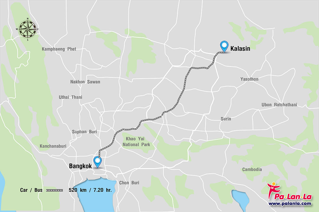 - รถยนต์ (Car/ Bus) การเดินทางโดยรถยนต์จากกรุงเทพฯ ไปจังหวัดกาฬสินธุ์ มีระยะทาง 520กิโลเมตร ใช้เวลาเดินทางประมาณ 7 ชั่วโมง 20 นาที