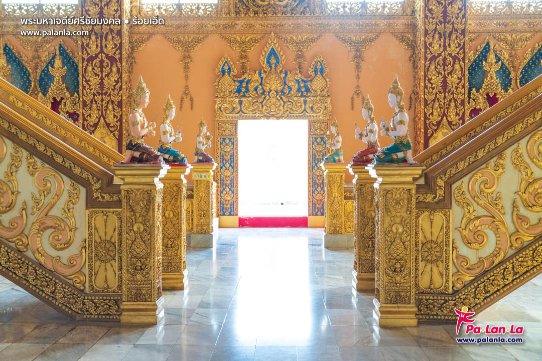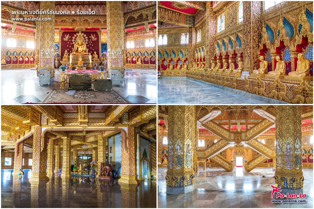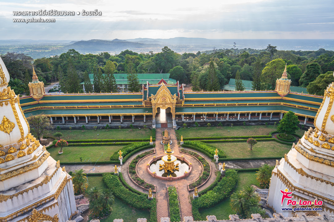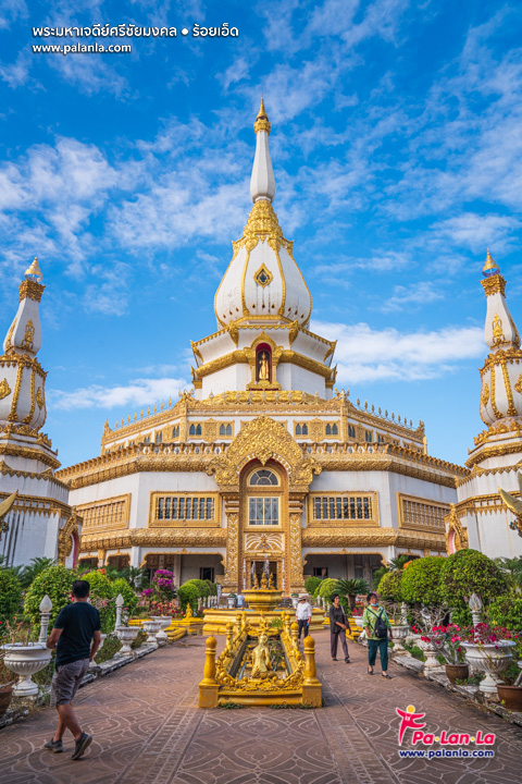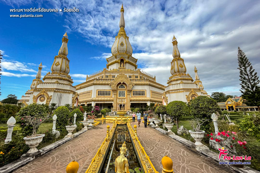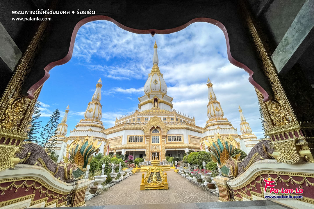 พระมหาเจดีย์ศรีชัยมงคล (Phra Maha Chedi Sri Chai Mongkol) มหาเจดีย์ขนาดใหญ่สีขาว ตกแต่งลวดลายตระการตาด้วยสีทองเหลืองอร่าม สถานที่ศักดิ์สิทธิ์ที่มีความงดงามราวกับดินแดนสรรค์ท่ามกลางธรรมชาติภูเขาเขียวของจังหวัดร้อยเอ็ด